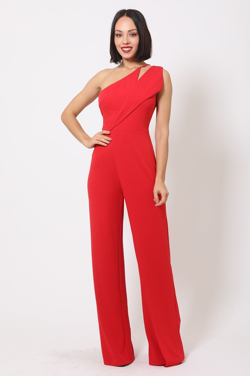 One shoulder jumpsuit w/ small opening. Frontline Flared Leg Design, Back zippe