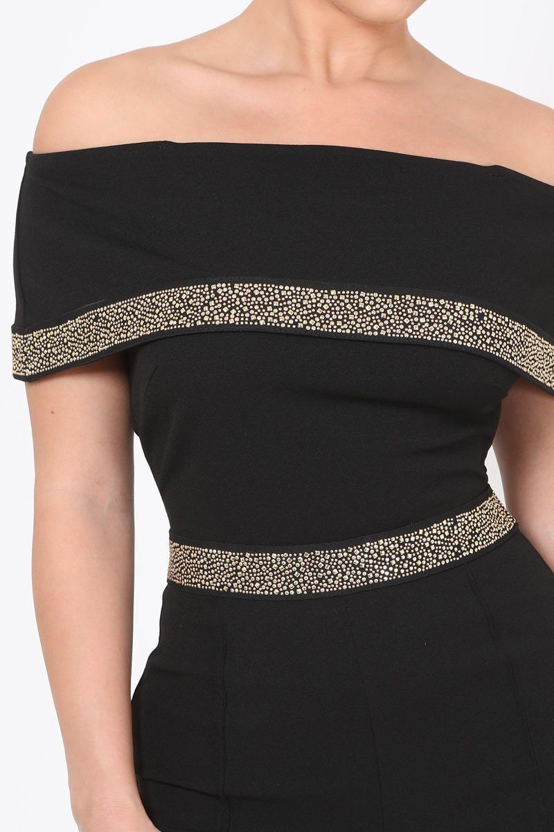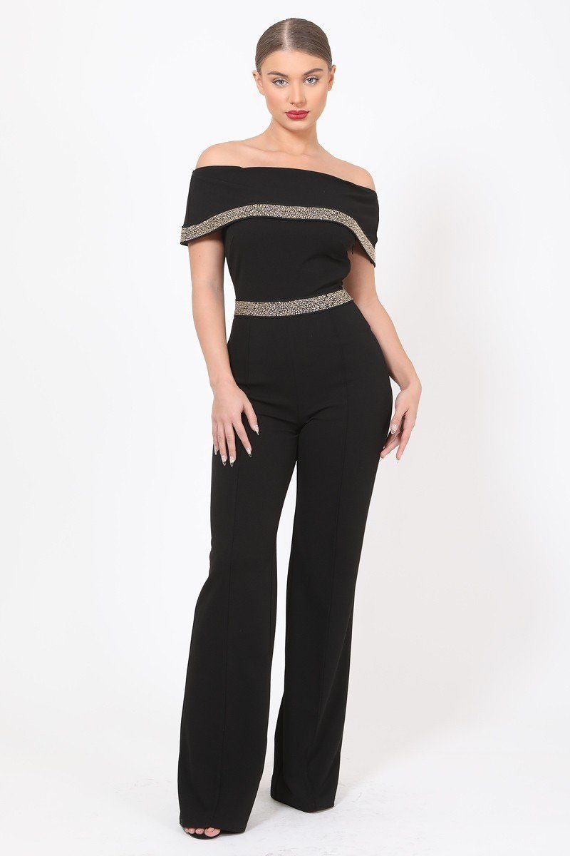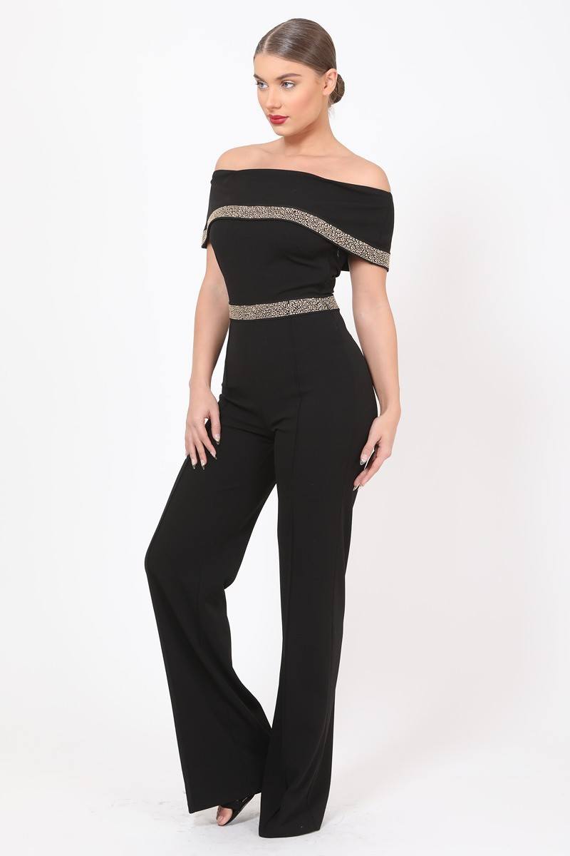 Off Shoulder Jumpsuit. Three Simple Pattern Line, Zipper on Side Front-line Flared Leg Design