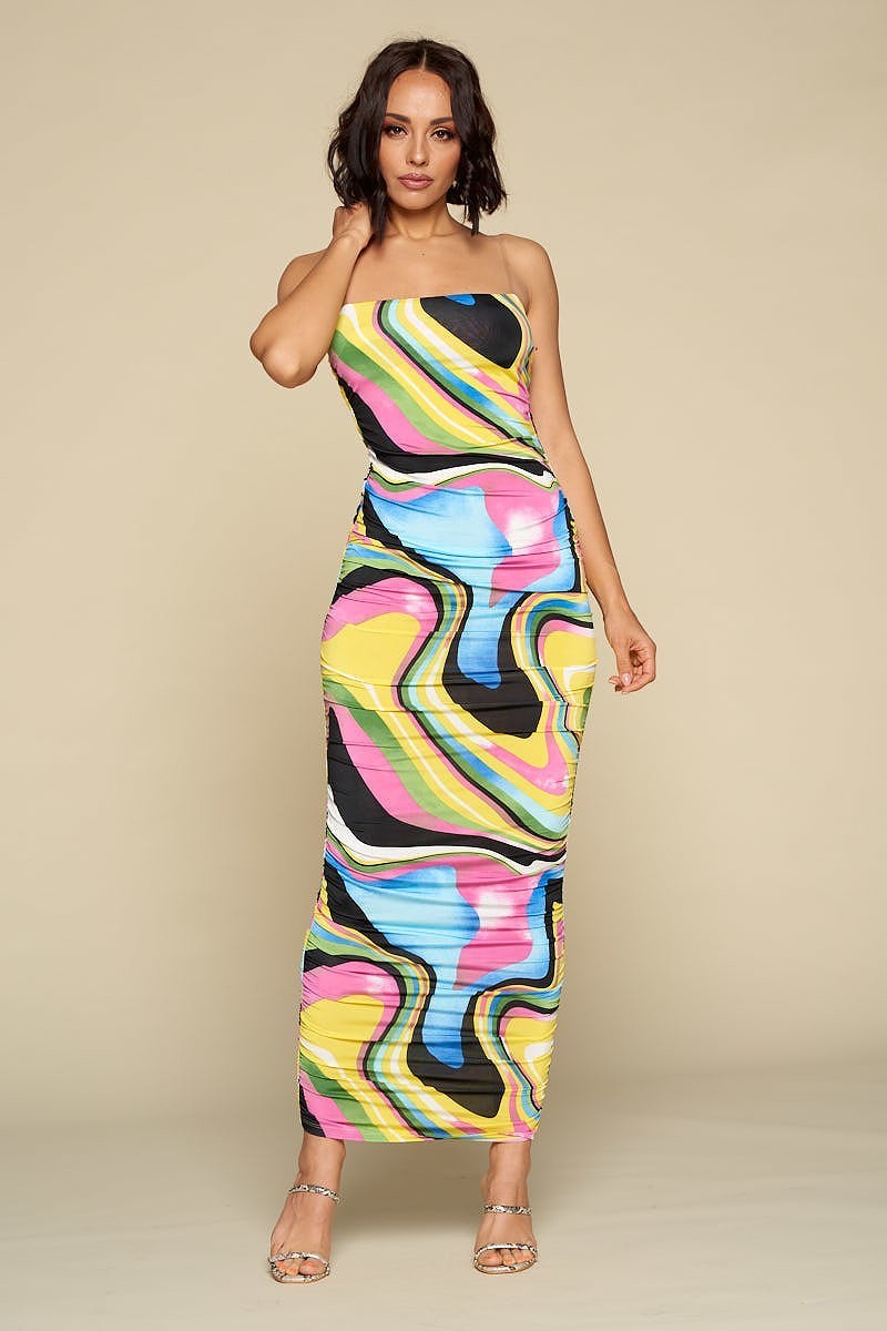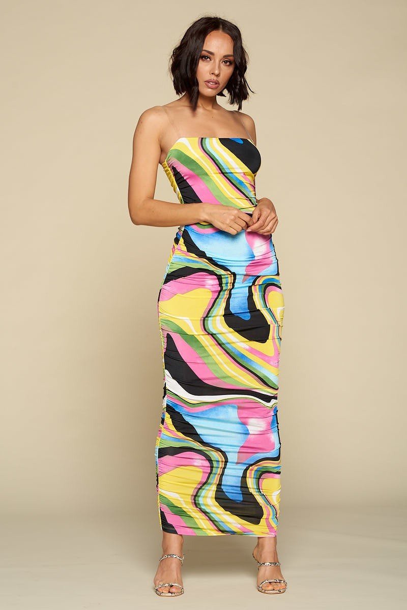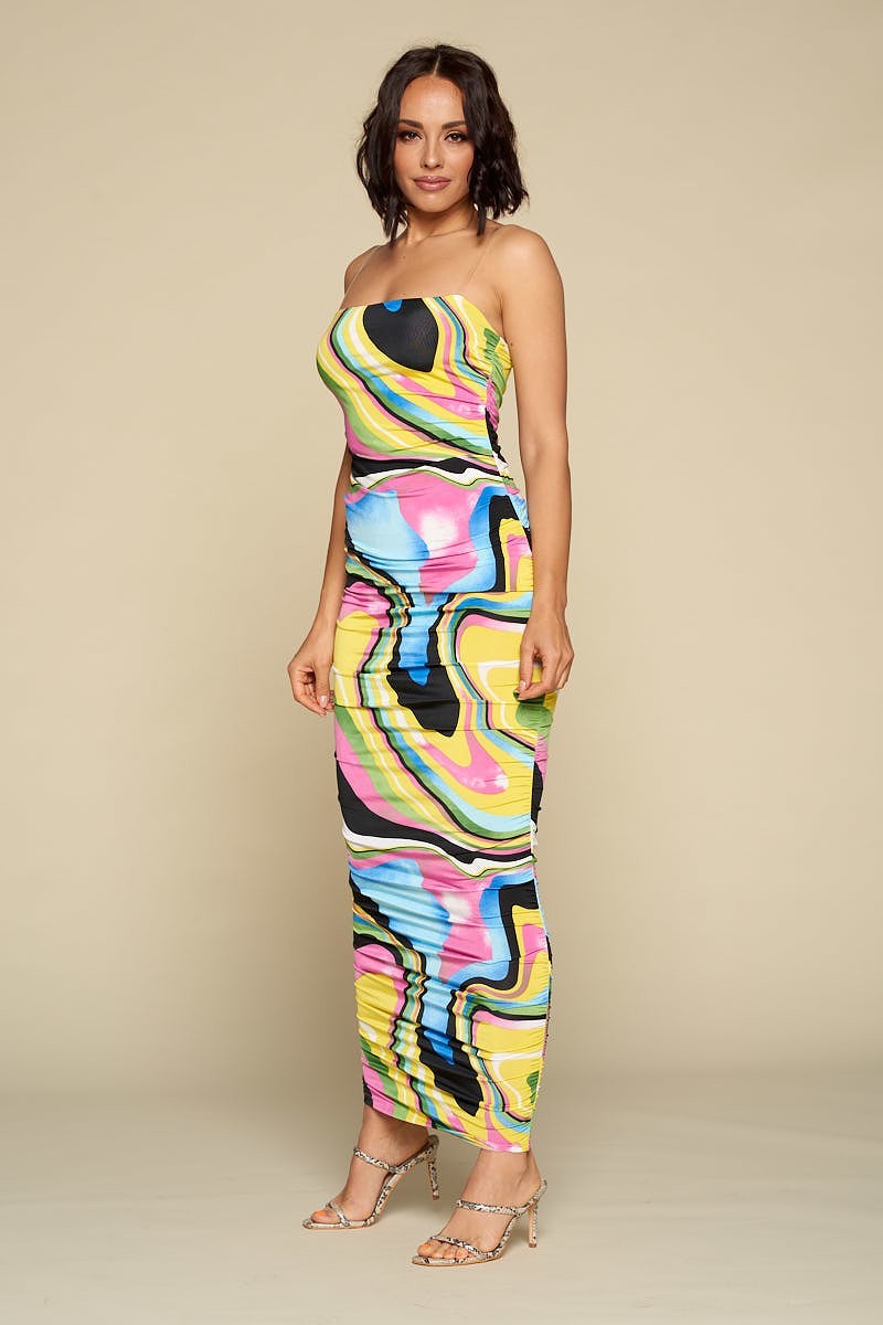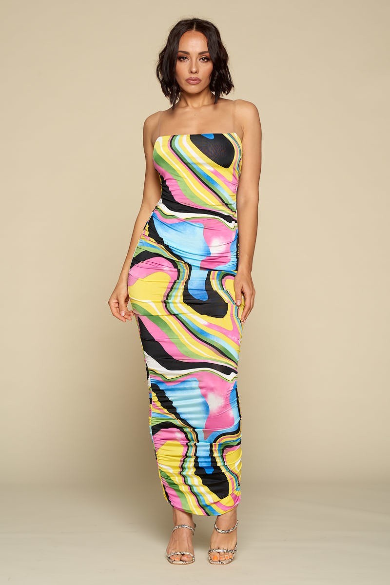 Multicolor bodycon maxi dress, clear spaghetti straps, ruched detail